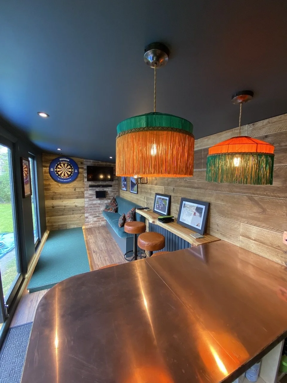 The industrial-style shelving and table were custom-made on-site using bespoke materials. The table along the back wall is crafted from a solid piece of curved wood with industrial piping for support. Stools with steel bases and leather tops were sourced from Nkuku. Reclaimed scaffold boards were used on the back wall, obtained from UPCYCLE U.K. for an authentic touch. A darts platform with LED lighting was added, along with an anthracite electric radiator for year-round use. LED spotlights and pendant lighting with dimmers created a warm and ambient atmosphere. Lampshade pendants from Beauvamp were specially ordered to match the seating and cushions in bright orange and green. Light switches came from Dowsing and Reynolds, and the cushions featured exclusive fabric from Blackpop.