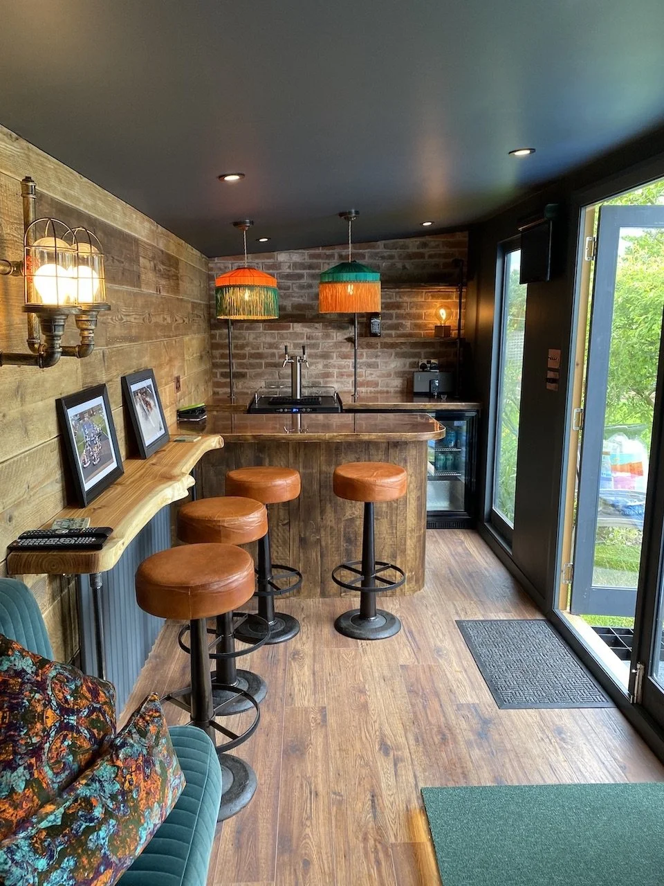 This Nottinghamshire garden room began as a shell, Howson Design project-managed the transformation from start to finish, arranging builders, electricians and a carpenter. The brief was to create a high-end games room and bar: a communal space for friends and family to get together. It needed to be somewhere to relax, have a drink, and listen to music. The client’s wish list included a copper bar, beer fridge, beer tap and dart board.